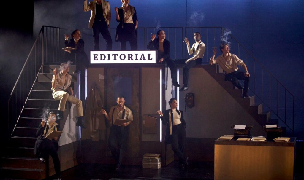 La scène d’ouverture donne immédiatement le ton. Dans un décor de bureaux des années 40, les claquettes résonnent, le rythme s’installe et, sans vraiment s’en rendre compte, on se laisse embarquer. Les tableaux s’enchaînent à une vitesse parfaitement maîtrisée et, très vite, cligner des yeux devient presque un luxe. La scénographie, pensée par Federica Mugnai, joue un rôle clé dans cette dynamique. Les décors, en mouvement permanent, permettent de passer d’un univers à l’autre avec fluidité, tandis que le travail de lumière, signé Alex Hardellet, vient souligner chaque ambiance avec justesse.