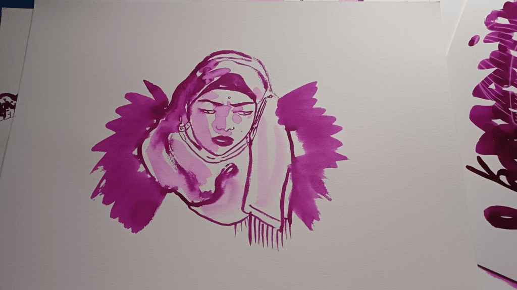 Les récits se succèdent, un·e à un·e, marqués par la tragédie, l’exil, la guerre, l’immigration vers la France. Une femme raconte sa vie dans un camp de réfugié·es en Syrie : enceinte, déjà mère, elle perd son mari. Pourtant, au cœur du camp, elle fonde une école pour permettre aux enfants de poursuivre leurs études, certains allant jusqu’à obtenir des diplômes. Sur la toile, Marion Duclos dessine une femme voilée dominant le camp, le visage brisé comme un puzzle. Puis, geste symbolique, elle retourne ces fragments et les transforme en fleurs : de la cassure naît la vie.