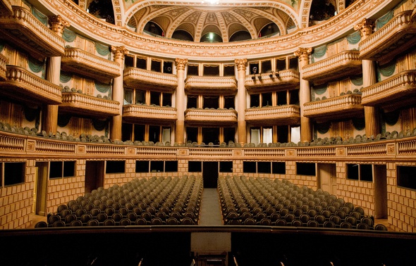 Poussez les portes du grand théâtre : voyez les escaliers en pierre de taille, les bas-reliefs, les colonnes impériales, les sculptures. Entrez dans la salle de spectacle : observez le lustre scintillant, la voûte peinte, les dorures qui cerclent les baignoires. Installez-vous au paradis : jouissez du confort relatif des fauteuils, de la vue imprenable sur l’ensemble de la salle sauf de la scène, et profitez de la chaleur suffocante de centaines de personnes qui monte jusqu’à vous.