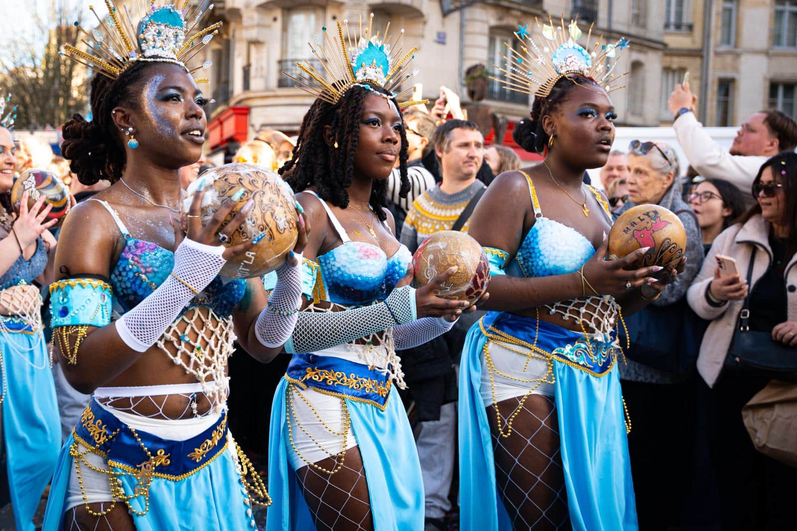 Cette année, le carnaval se plaçait sous le thème évocateur de « Fleuves et mer ». Au-delà de sa dimension purement esthétique, ce choix thématique a une portée plus profonde : il célèbre les ressources aquatiques qui ont construit Bordeaux, tout en rappelant subtilement leur fragilité dans un contexte de crise climatique. Créatures marines aux couleurs éclatantes, références aquatiques, maquillages en dégradés bleus et verts ont ponctué la parade. Le point fort visuel restait cet impressionnant kraken aux tentacules métalliques qui flottait majestueusement au-dessus de la foule — une image surréaliste qui a marqué les esprits.