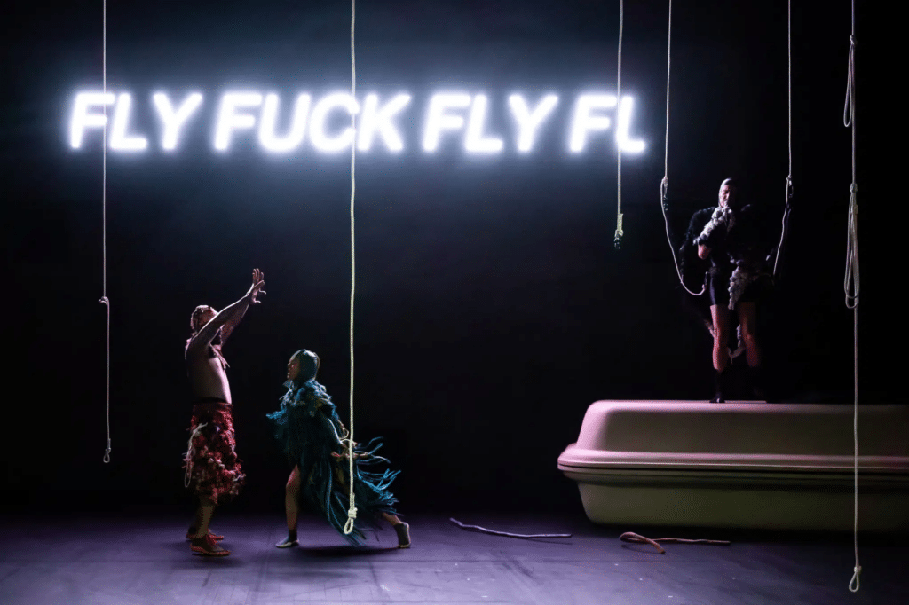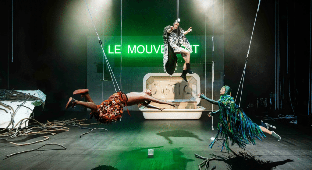 Le plateau devient un espace aérien où cordes, poulies et contrepoids composent un véritable terrain d’exercice acrobatique. Les corps, vêtus des costumes aux couleurs flamboyantes de Julien Andujar, évoluent suspendus, instables, toujours en mouvement, renforçant l’impression d’un monde sans ancrage fixe.