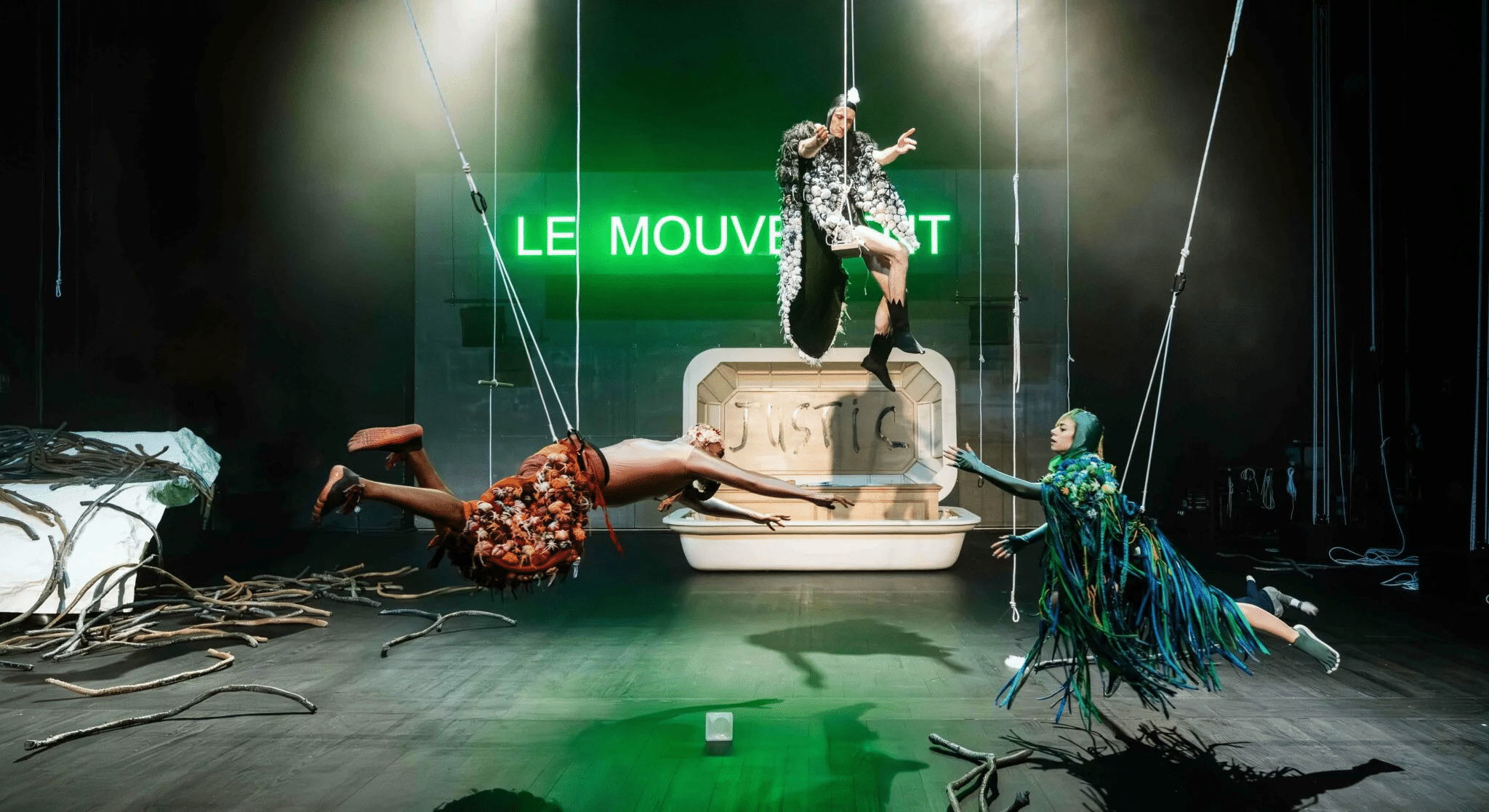 Le plateau devient un espace aérien où cordes, poulies et contrepoids composent un véritable terrain d’exercice acrobatique. Les corps, vêtus des costumes aux couleurs flamboyantes de Julien Andujar, évoluent suspendus, instables, toujours en mouvement, renforçant l’impression d’un monde sans ancrage fixe.
